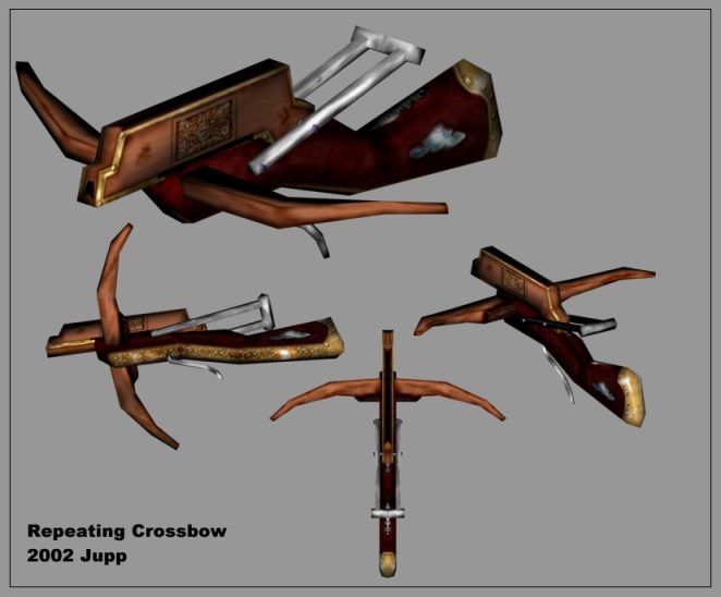 First sighted in the distant lands of Kara-Tur this truly exotic kind of crossbow can shoot 6 bolts in the same time when an ordinary crossbow shoots one arrow. Although it takes a special skill to handle this weapon one should not take this bow lightly. In the hand of a proven archer this bow can make a remarkable impact in a fight. P.s.: When viewing the model in the Model Viewer click on the bow and move the mouse up and down fast, then zoom in to the max. Then you can rotate it as you like. I dunno why it doesn't move correctly when zoomed out....