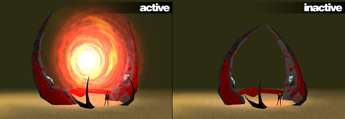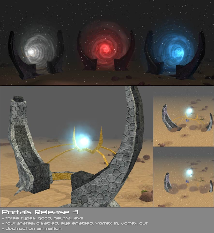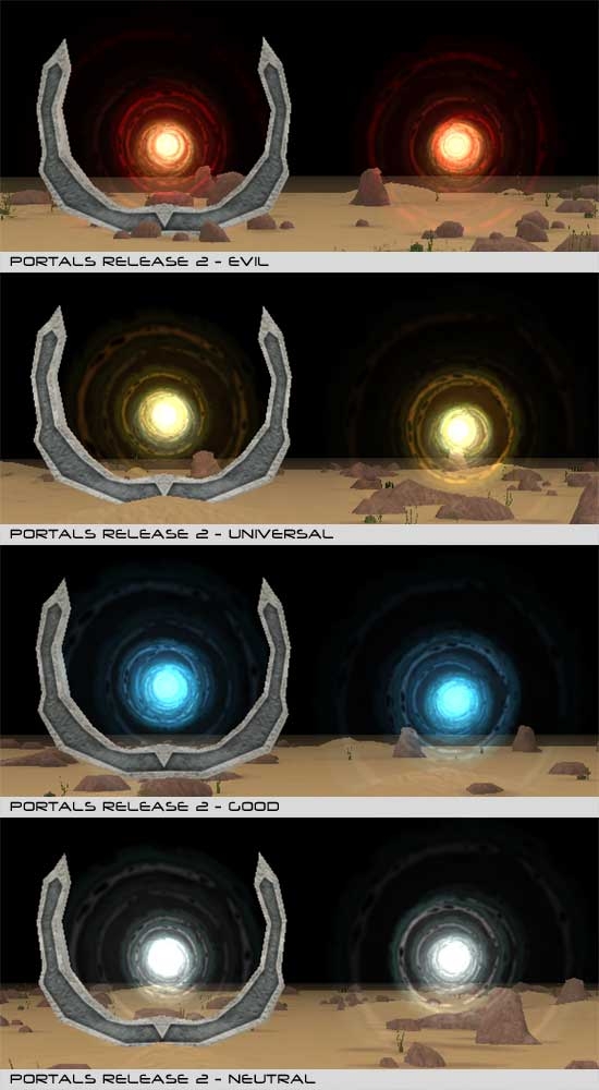 The portal effect in the 3.1 and the latest release are stunning. I'd like to see a placeable without the stone portal and just the effect - that would be extremely useful, as it could represent a portal or gate being opened up by a spellcaster. The r2 releases could be useful for this, but the aelsia and the 3.1 portal effects are just so beautiful....