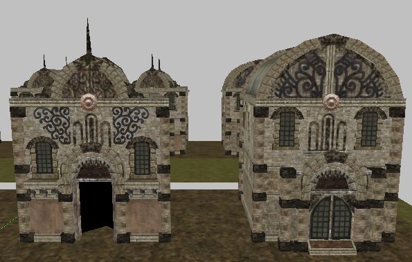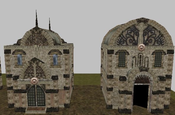 They were meant to go into the TNO tileset, hence the ground height is at 5.0 instead of 0.0. I put them in the micro-tileset so you can have a look at them. They worked fine in the toolset, but they crash the game and I can't find out why. I strongly suspect it has to do with the walkmeshes. Feel free to use them in your own tilesets if you know what's wrong with them and can fix it. If nothing else, you could use the textures for the NWN2 house placeables by TheGeorge.]