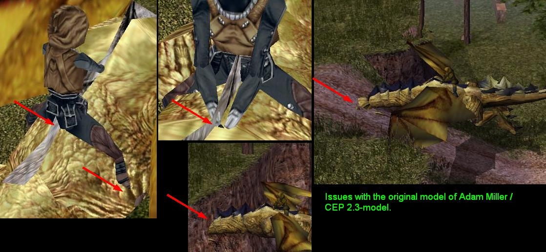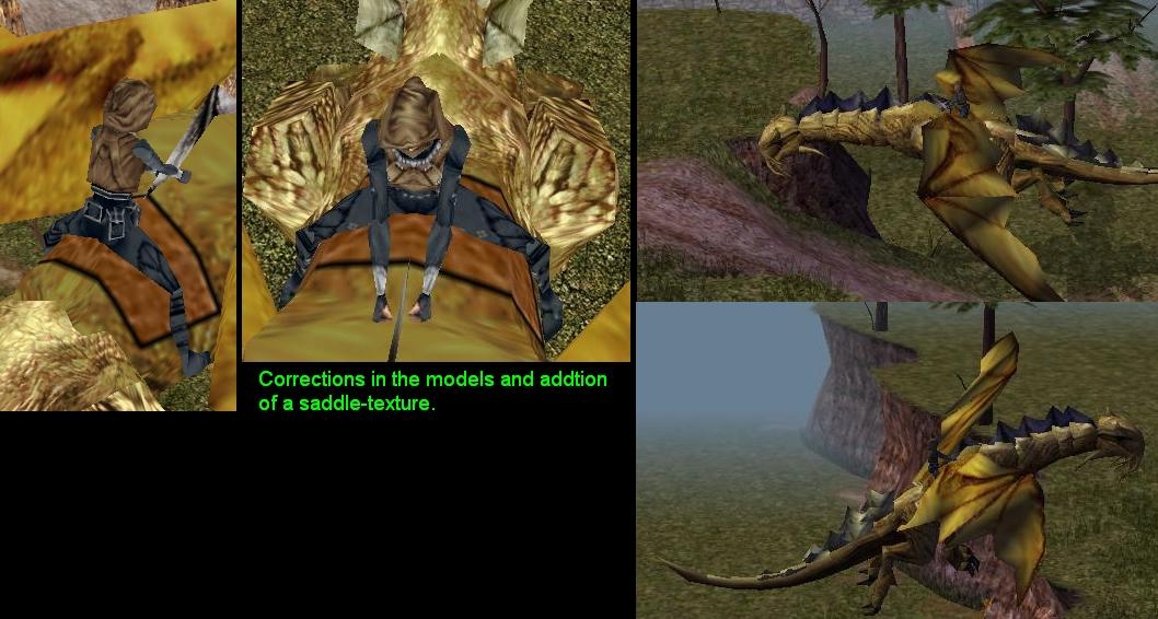 Besides those little corrections (See screens and below), I wanted these models to be usable for players. For this, the PC would have to change the appearance into that of the drigon&rider-model.One problem was, that the original hooded riders didn't have a mask, so a bearded PC would have a different face as a dragonrider. Another problem was, that the clothing / coloring of the clothes of the original dragonriders cannot be made as an armor-item = no PC-armor model would match the riders textures. Either model or color would not match.