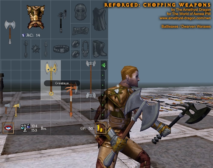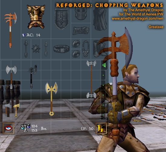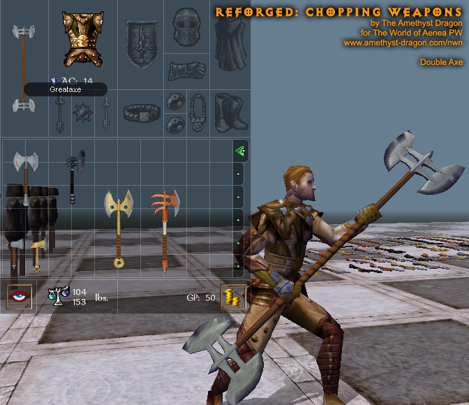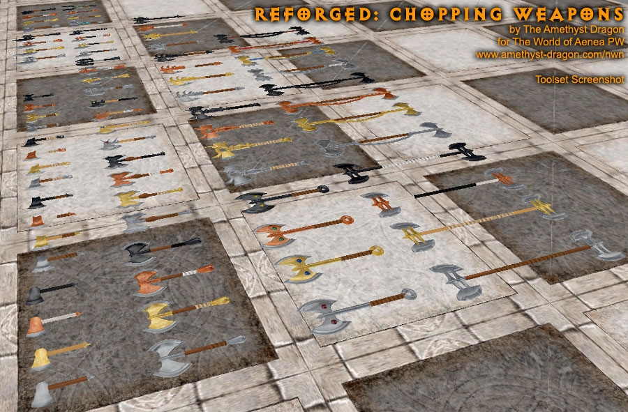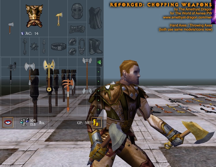 This package includes a change to baseitems.2da to make throwing axes use the same icons/models as hand axes, just as dwarven war axes use the same icons/models as battle axes. If you are already using a copy of this 2da file in another hak, you'll want to change your copy's entries for throwing axes to match the model and icon names for hand axes (leaving all other columns as they are, it's just an appearance change).