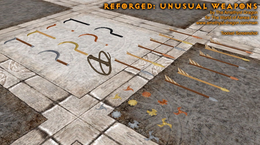 Henesua: The shurikens in this set are made to replace the existing shuriken models and icons. If using my "improved shuriken" hak, the reforged ones look better, but don't replace all of the ones from the improved hak (which has additional shuriken, not just replacements for default ones). _________________________ World of Aenea (Hall of Fame PW and the origin of all my works)