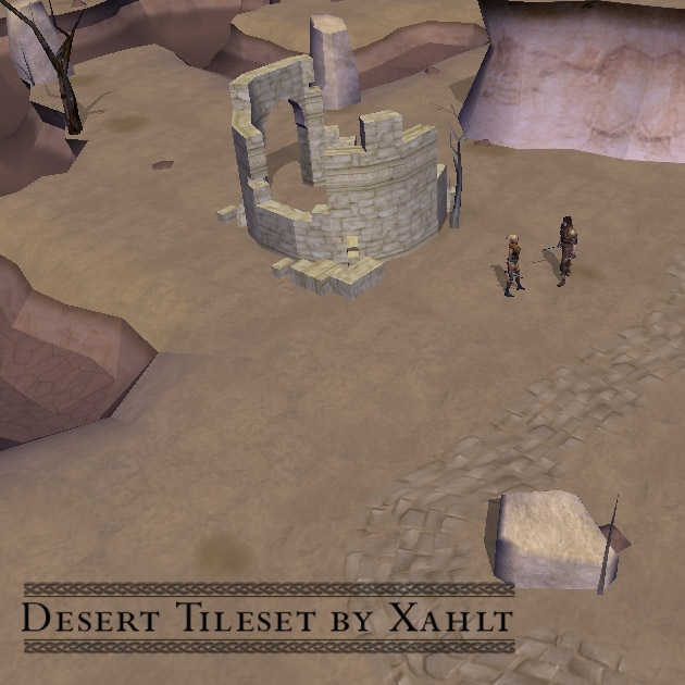 This is a duplicated tileset (7MB) for use in NWN. To use the tileset you must add this hak pak to your module. You can then create a new area using a tileset called 'Grains of Sand'. Any user of a module created with this tileset will need this hak pak installed on their system to play the module. Please note that this tileset is a simple reskinning and has no custom geometry (with some extremely small exceptions). As of this version the tools to create custom geometry are not extant, so eventually this desert won't be quite so barren :) This version has severely dimensionally compressed images to make it close to a reasonable download size, *MAKING THE VISUAL QUALITY NOT AS HIGH AS IT COULD BE*. Hopefully in the future these textures will be dds files which will make it even smaller, but with more detail.