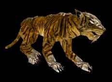 Any jungle cat is an animal to fear... the dire cat is a nightmare in comparison. Standing twice as tall as a man at the shoulder and over 35 feet in length, its body rippling muscle, the dire cat is terrifying to behold. Even though it is massive in size, it is as well-versed as its cousin in moving secretly through the tall jungle grasses and heavy undergrowth, stalking its prey before pouncing upon it in a deadly assault. Its huge teeth can tear apart a man-sized opponent easily...and should it get ahold of its target in its powerful jaws, it can use its long claws to rake for deadly damage. The dire cat is a vicious predator that can overpower even well-prepared groups of men and is not to be underestimated.