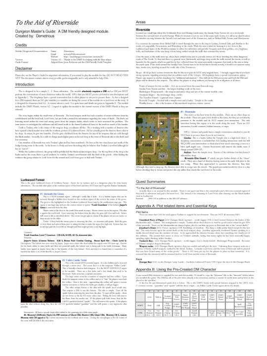 Version 1.2 Lord Noris has put forth word that a reward is posted for information regarding a series of local thefts from the Riverside weaponsmith. You have traveled to the small town found in northern Fauren, just south of the Lurkwood forest, to hopefully collect the reward. Guards of the town saw dwarves leaving the city headed north towards the great Lurkwood forest, but ran into the all too common orcs before retreating back to the safety of the town. The vast Lurkwood forest lies 2 days travel to the north and it is very sparsely inhabited. It is a hiding ground for orcs and thieves and known for a series of ancient tombs below the surface of the forest. A simple robbery or something deeper? A DM Required module: Built from the ground up to be DM friendly - submitted for approval. Sample of documentation shown. Includes 19 page DM document, game posting document, and customized avatar and instructions to further customize the avatar.