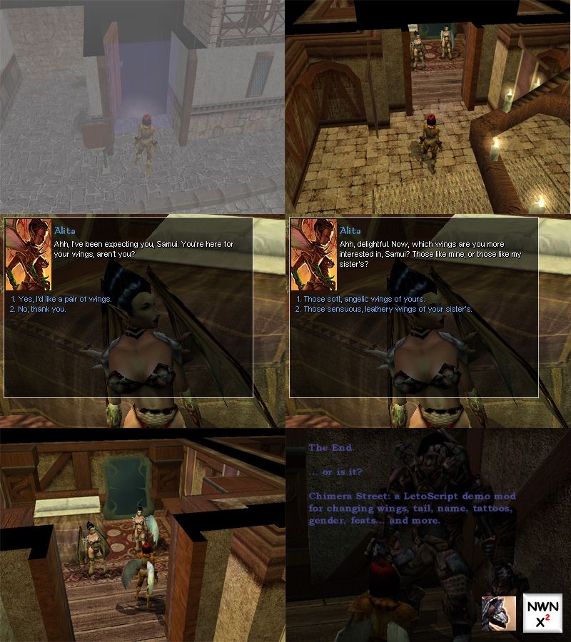 This module demonstrates the use of NWNX-Leto on a servervault game to edit BIC files while the server is running. Adding wings, a tail, changing your name, adding feats... these things and much more are possible with NWNX-Leto. Version: THIS IS A BETA VERSION. It is not yet complete, and only a few things can be changed. (Wings, name, voice, gender.) Compatibility: This version is Windows only. Linux compatibility forthcoming. Requires: You must download and run NWNX2 for this to work. Read the included Readme.html for instructions. Visit weathersong.infopop.cc for help with this module or your own ideas for NWNX-Leto.