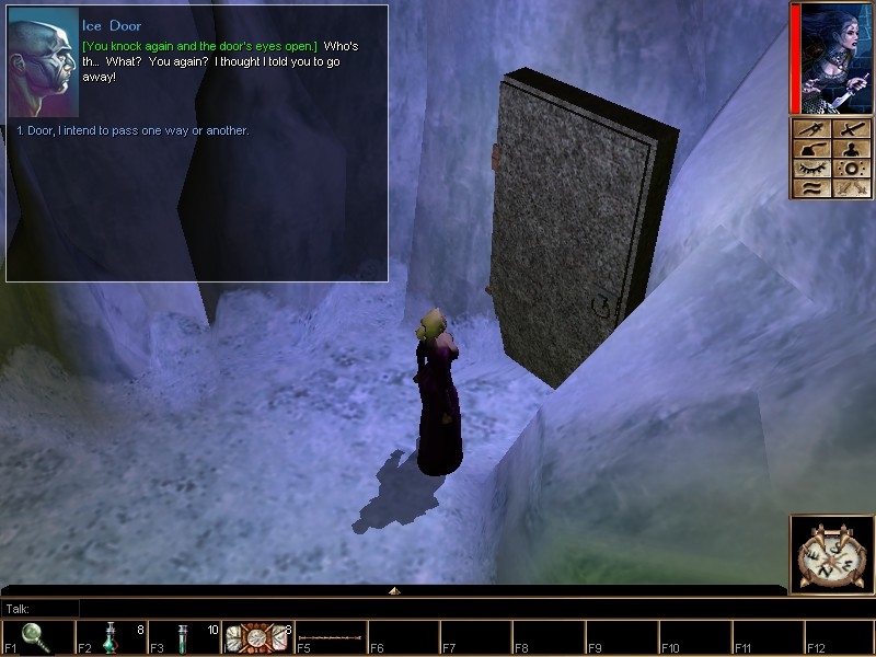 This was a very interesting module/story and it kept me interested right through it. It had a lot of very interesting concepts like the door, Nigel, Giant, Fang, how you solve quests, various actions in dialog, the different quests like the ice blossom etc.