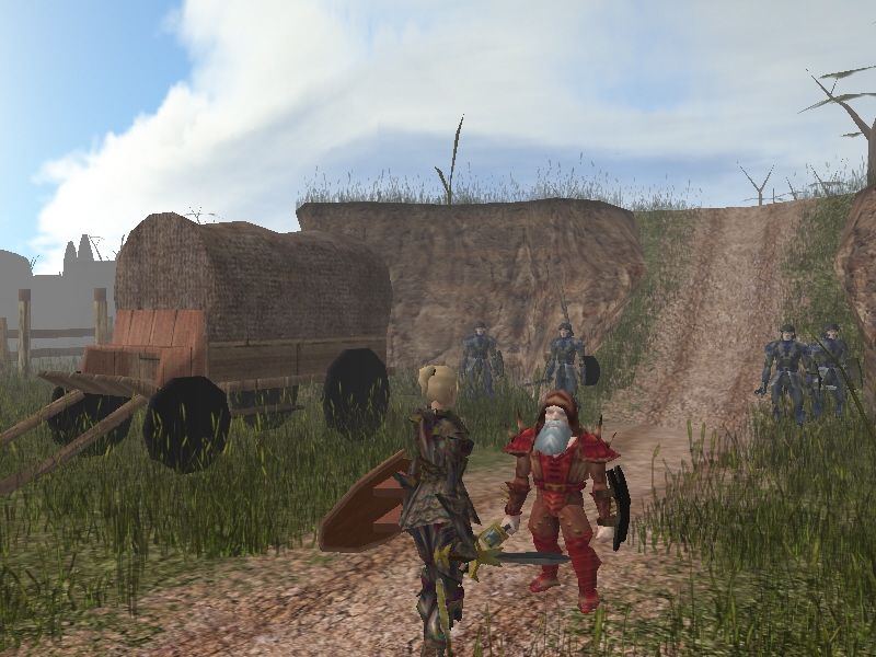 ShadowySweetness, sorry if I hadn't had the chance to check these messages in days but better late than never! On the hill very near to where you encounter the guard, there is a section where you can walk up the hillside, and then at the very top is an area transition on the ground. Look on the ground on top of the hill for it, when you get up to the hilltop, and when you find it go on through it to get to the ancient ruined keep, where the guard wants you to go to avenge his fellows. Happy questing!