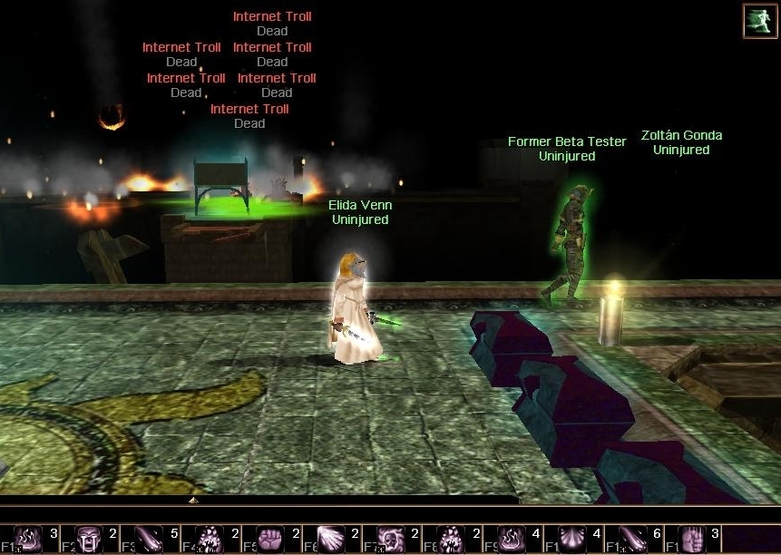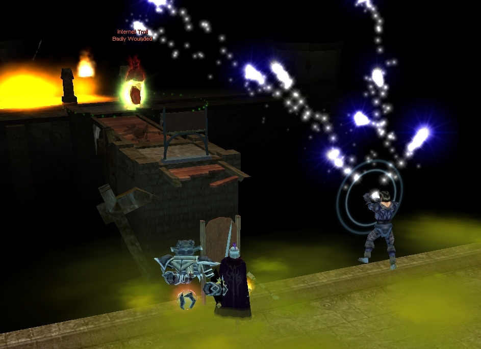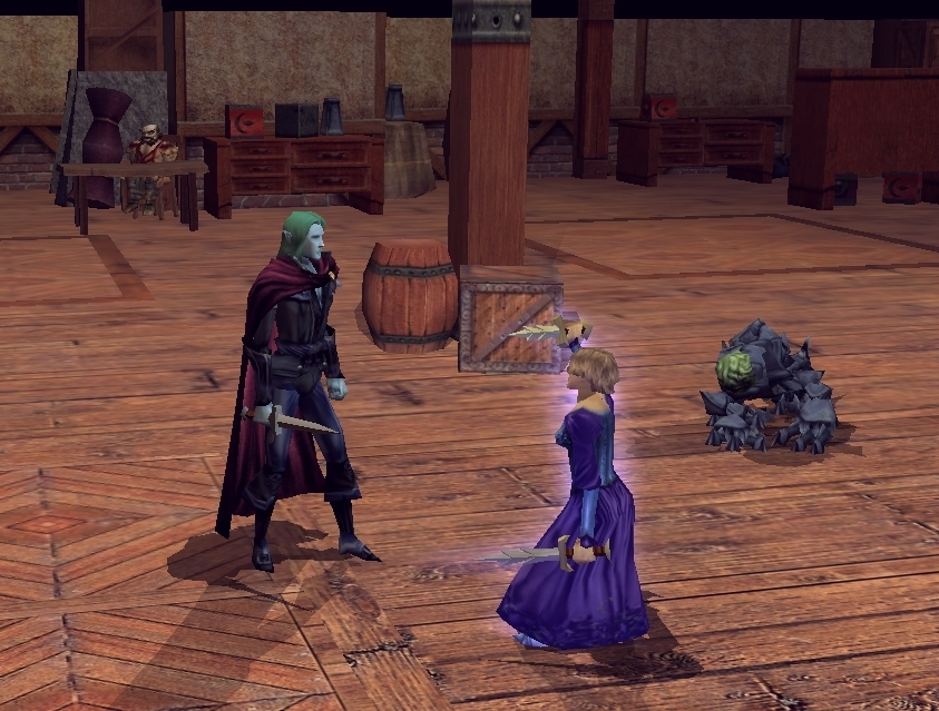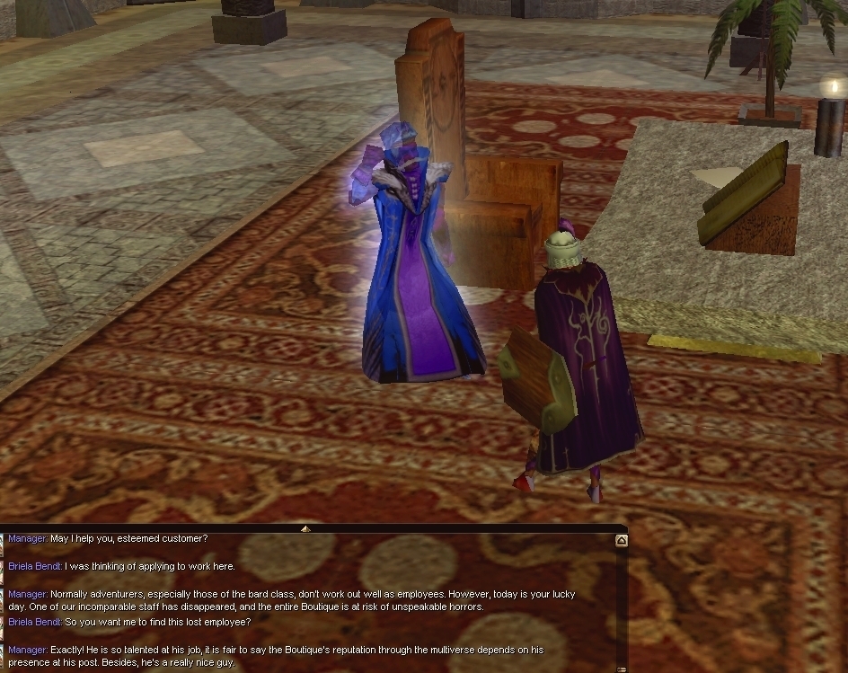 The Boutique is more gamelike and less arenalike than most "store" modules. No one is handing out money on demand; instead, they have their own hands out at every turn. You are expected to bring plenty of cash, tip well, and pay the highest markup for the best stuff, as in life. There are plenty of opportunities to spend a fortune: Amost everything Bioware (through HOTU and patch 1.69), custom loot, souvenir loot from other modules, and the opportunity to add enhancements to armor, weapons, and accessories. There are several money-making schemes, a Magic Mushroom that will make you grow or shrink, and a salon to help with your personal needs. Look in the Vintage Collection for a survey of modules to visit, directions to customize your own Boutique, and constantly spawning trolls to shoot. See how modmakers deal with trolls they catch.