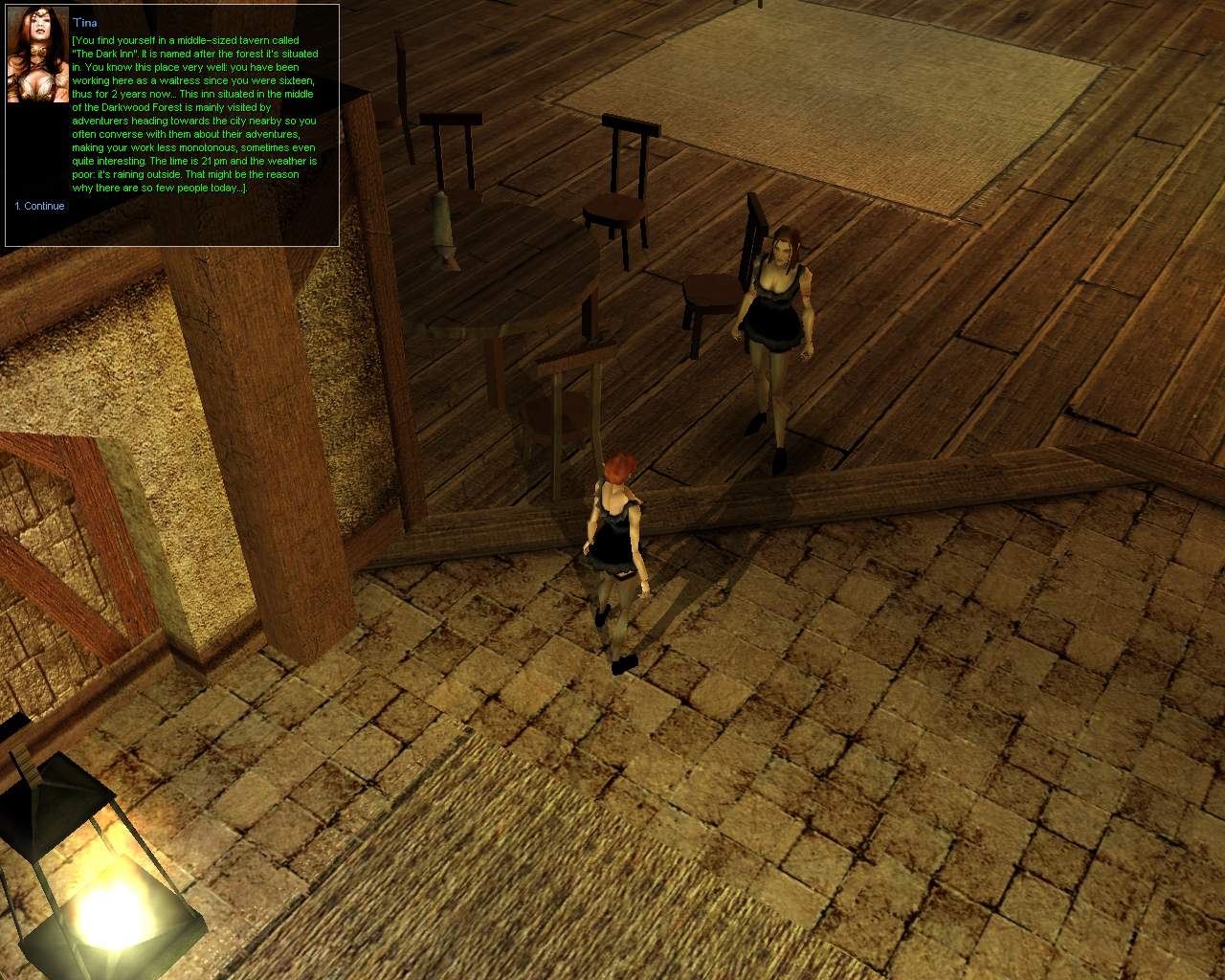You find yourself in a middle-sized tavern called "The Dark Inn". It is named after the forest it's situated in. You know this place very well: you have been working here as a waitress since you were sixteen, thus for 2 years now... This inn situated in the middle of the Darkwood Forest is mainly visited by adventurers heading towards the city nearby so you often converse with them about their adventures, making your work less monotonous, sometimes even quite interesting. The time is 21 pm and the weather is poor: it's raining outside. That might be the reason why there are so few people today...