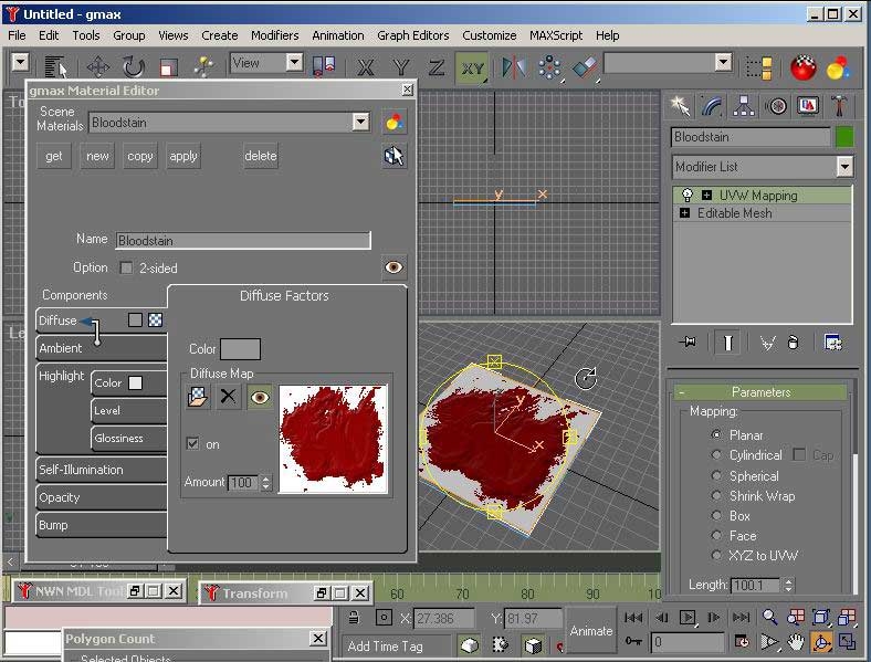 A video tutorial similiar (very) to my other tutorial only this time shown from the viewpoint of a GMax user. Shows start to finish how to use GMax and Wayland's MDL Script (http://nwn.spectrumanalytic.com/) version .3a (make sure you get .3a, a bug in .3 came to light while I was making this tutorial). It shows how to make a simple flat plane placeable good for bloodstains, carpets, footprints, maps or papers, etc... I hope you enjoy it.