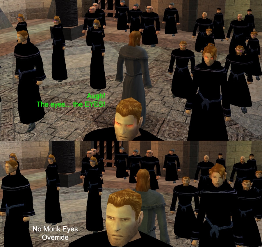 one day, on some thread or other, somebody was complaining about the new green vs purple colour for neutral monk eyes, and then someone said, 'just go change the vfx_monkeyes.mdl file.' and i said to myself, hang on...!! all this time, everybody's been telling us how monk eyes are hard-coded in and you just CAN'T get rid of them, and all this time, all we had to do was just make some null mdl files to replace the glowing eyes!?!??!?!