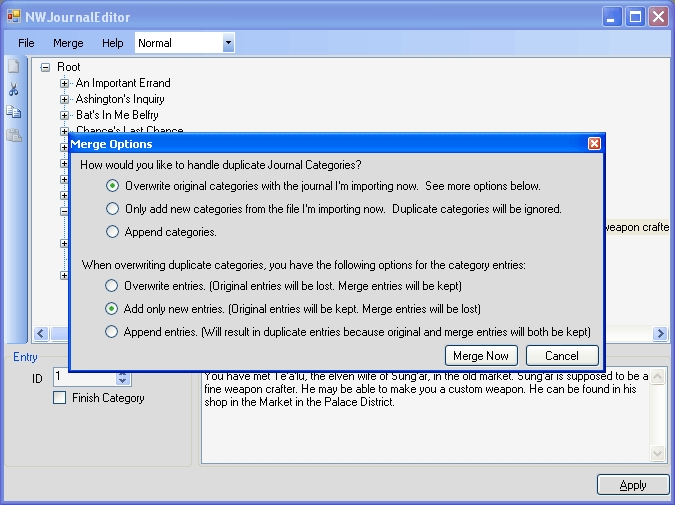 This stand alone application allows you to edit, merge, and save the NWN Journal.