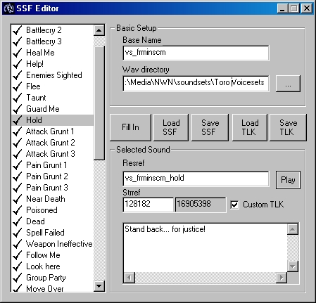 I am running SSF Editor under Win XP, SP 2. This program works fine while contructing the soundset file, including the preview wavs playing without issues. But the soundsets never work when merged into the game, even if a default BioWare soundset is edited as a template. NWN Explorer also crashes when an attempt is made to open any soundset file generated by this program, and SSF Editor itself crashes frequently when saving an .ssf file that it just created. Is anyone else out there having similar problems? _________________________ Realms Of Destiny PW
