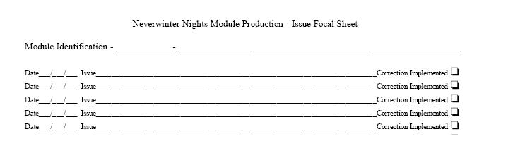 I use this form when I'm building or play-testing a module - it helps give some sort of order to the issues that inevitably arise. The page has 42 lines to record various entries, and includes a date section and a check-box section. This is a simple file, a one-page document that may come in handy for those of you who have a thing for organization (like me).