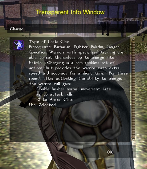 I noticed that you are an expert with the graphic user interface of Neverwinter Nights. Are you able to disable the character information screen? If so, that would be of great use to me. I am in the process of creating a custom dialog.tlk file that removes all number related information from weapons and armour in order to make the game more mysterious and fun, but alas, the character information screen still displays these numbers. Any assistance you can give would be most appreciated!
