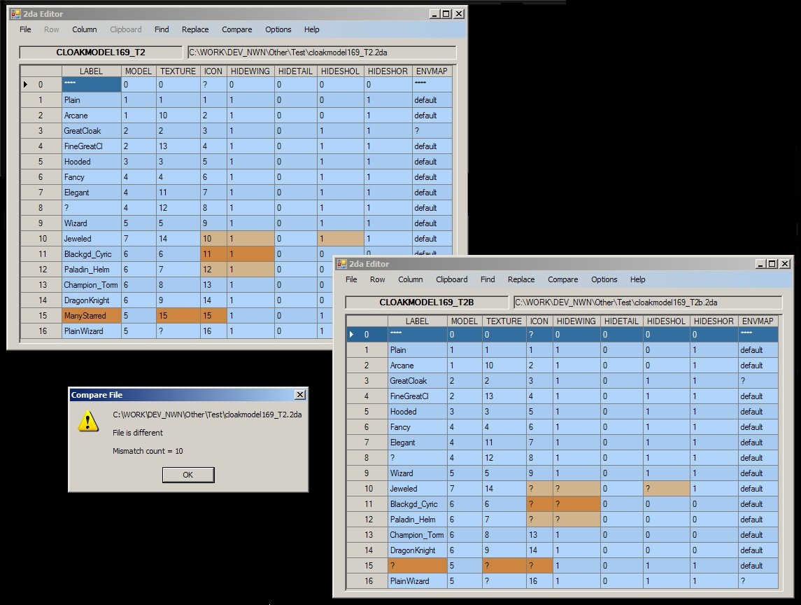 This is a C# program which displays 2da files in a grid format, allowing viewing and editing, (copy, insert, and delete). It requires the .Net 2.0 framework in order to run.