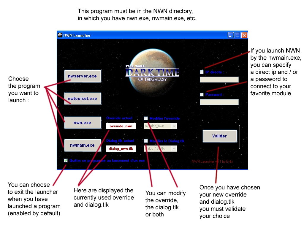 I think it's worth a translation. It's hands down one of the best things for NWN that's ever been created. It's the closest thing to getting haks to load at startup and it's so SIMPLE to use. Personally I'm not a Star Wars fan, so just for looks a fantasy-oriented or just a plain blackground is more preferable, or even the ability to choose a background. Just my own personal suggestions, your program works great as is, I just can't understand non-english.