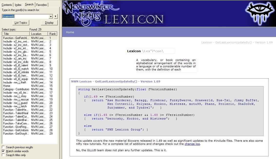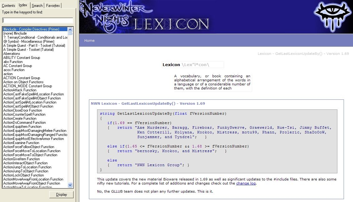 This is an official update to the Lexicon chm file. It is the final update by the GetLastLexiconUpdateBy() Team. Please note that GLLUB Team is not part of the original NWN Lexicon Group. We merely picked up where they left off. The previous Lexicon version by the NWN Lexicon Group from November 2004 contained content through 1.64. This update includes content through 1.69.