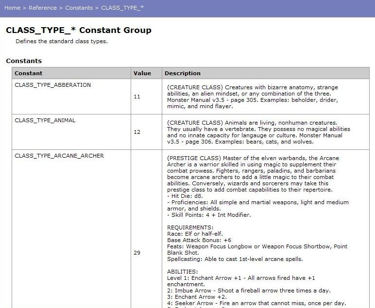 CLASS_TYPE_* Constant Group: Updated with new constant added in 1.69 and filled in description column. Description information added by Kookoo.