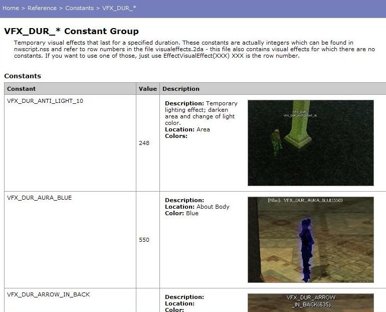 VFX_DUR_* Constant Group: Updated with new constants added in 1.69. Some of the arrow effects are really quite amusing, like "VFX_DUR_ARROW_IN_FACE". Screenshots once again taken by KooKoo.
