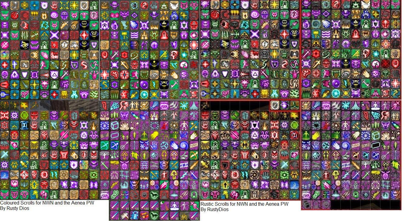 I can see the author worked on this, but I prefer Amethyst Dragon's first re-coloring pack, as his scrolls look clearer and have lots of definition. Besides, the PW's author had a color system that helped to easily recognize each type of spell. Maybe some work on Aenea's set, to make it old-ish without changing colors, would be better for spellcasting players like yours truly...