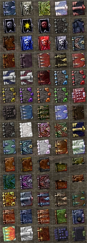 Was cleaning up my hard drive and found this little project I was working on 5 years ago. Seventy new book icons which are fairly generic (i.e. reusable) variations on the Bioware defaults with colors, details, and textures altered. I decided to clean them up a bit more and post them here. There are several matched sets and some damaged volumes including two half books and one with a nice lightning bolt hole through it.