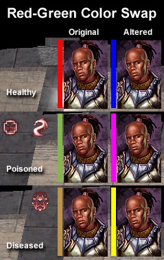 This small download is designed to alter the default health status (hitpoint bar) colors, changing away from red/brown/green so that players that may have red-green colorblindness can more easily tell the three main states apart.