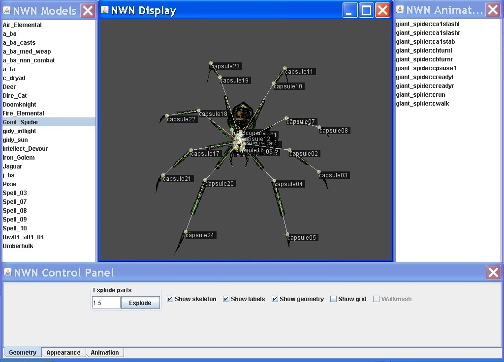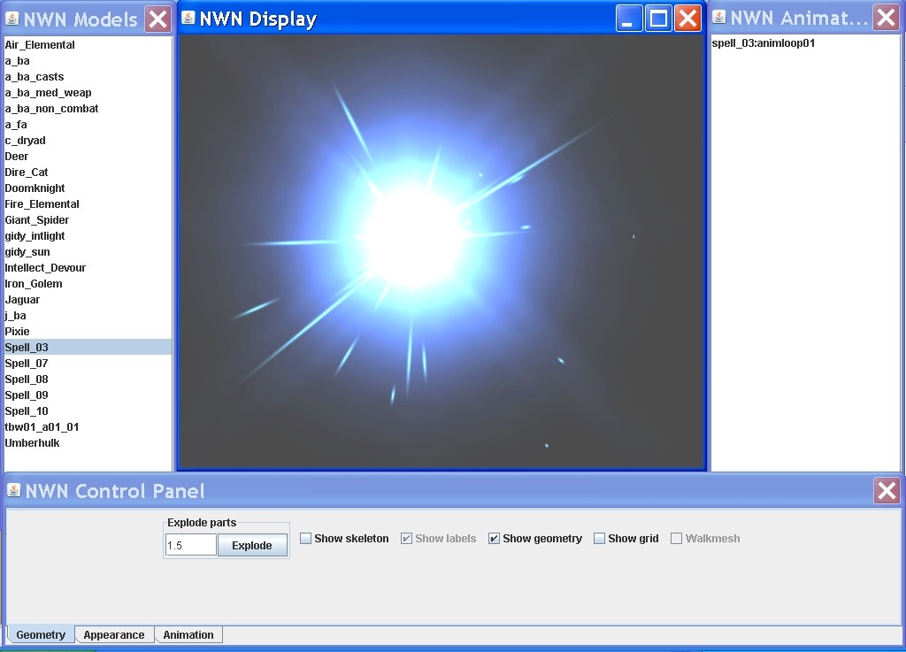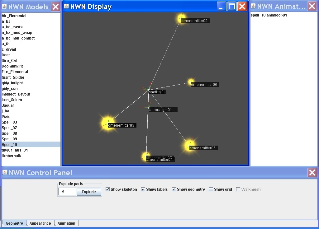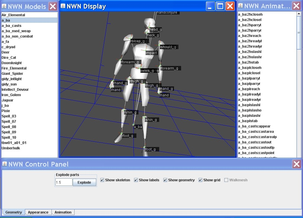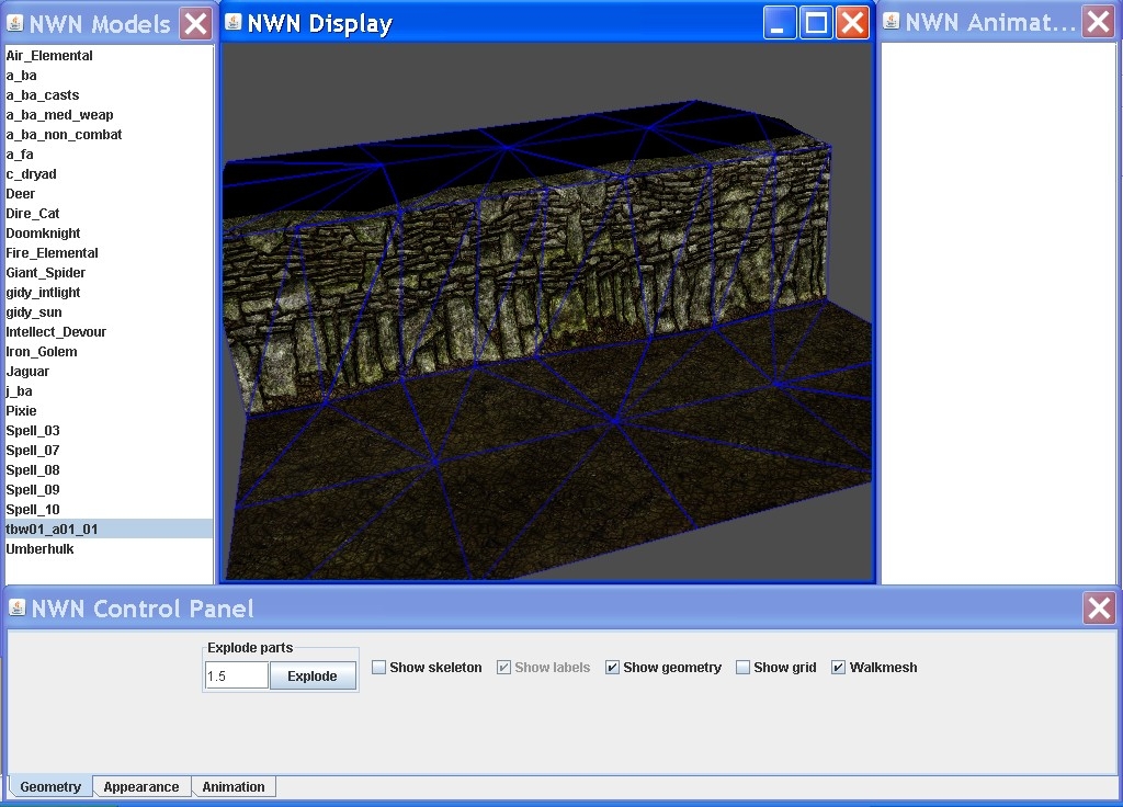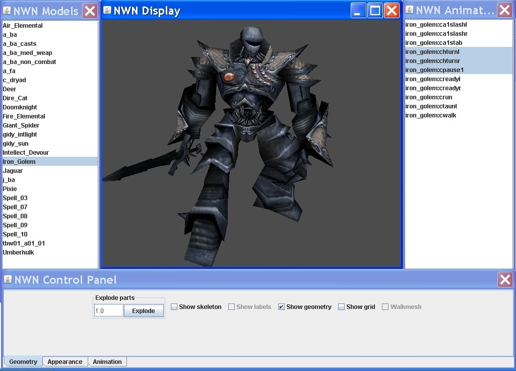 At the bottom of the "NWN Control Panel" are 3 tabs (Geometry, Appearance, Animation). Because of the placement of the bottom window, you will probably have to move that window up a bit to see them. Without knowing these 3 tabs are there you'll be missing out on some of the neater features of the model viewer.