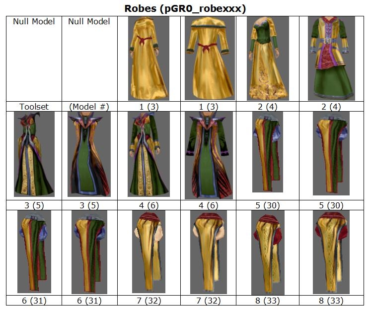 A word file that contains screenshots of all the Bioware standard helmets and clothing parts through version 1.69. The numbers under the screenshot reflect the toolset number (model number).