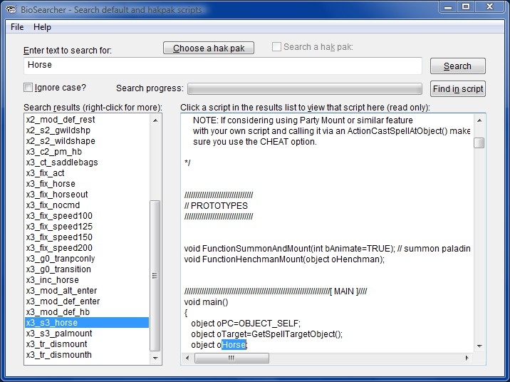 Search through the standard BioWare scripts in your NWN installation (or the scripts in a hak pak) with this utility. This is a modification of Lilac Soul's BioSearcher v2.0 to make the search aware of patch 1.69 scripts.