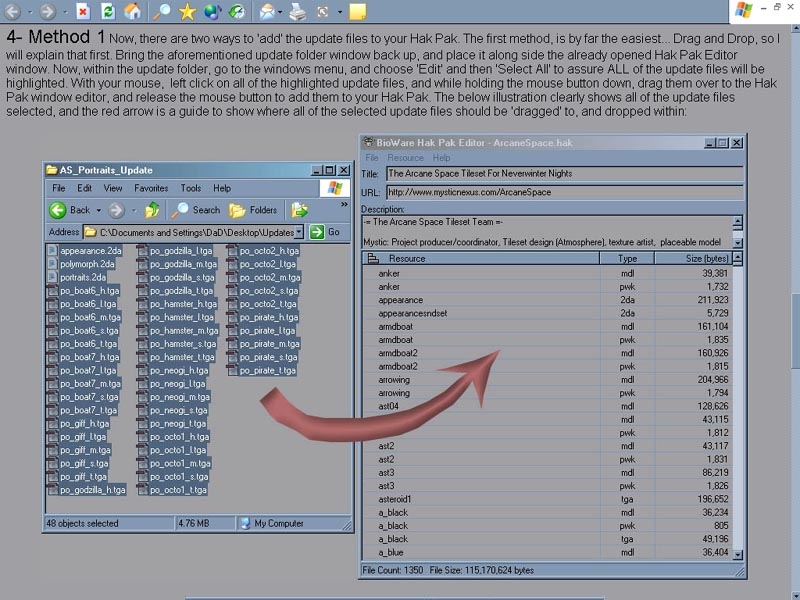 This tutorial will explain how to update your Hak Pak to the latest version. Although this tutorial is focused on the Arcane Space Tileset Hak Pak, the same method will work on ALL Hak Paks you wish to update. I made this tutorial especially for the beginner, and is thus detailed with graphic illustrations, as to not confuse any aspect of the Hak Updating procedure. This tutorial is in HTML format.
