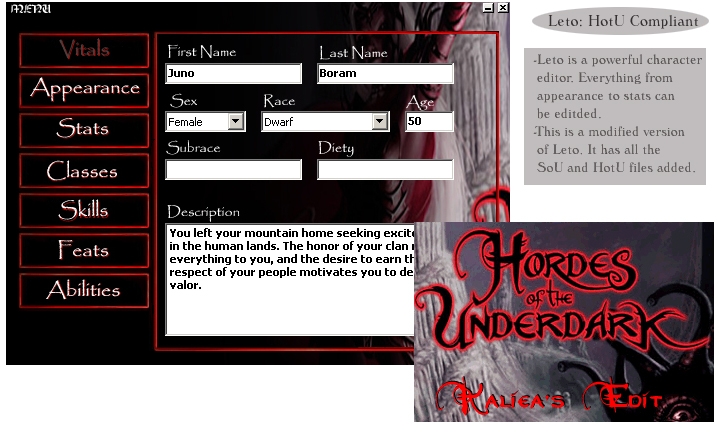This is a modified version of Leto. Leto is a character editor that allows users to edit everything from appearance to stats. This is a version of Leto that will work with characters saved with the HotU and SoU expansions. This is an unofficial release. Included with this is a new HotU skin for leto.