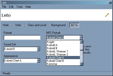 Pol@k, please respond more clearly. If you are, as I think you are, trying to say that Leto is 'evil' because it can be used to 'uber' your character thus 'destroying' the game, well let me just let you in on a little secret: not everyone cheats. Leto may be able to hack your character to level 40 with 100 in all stats, but it can also be used to simply give you a unique and unusual character, like a Drider, or a Kobold. Some people only use it for these things, like me.