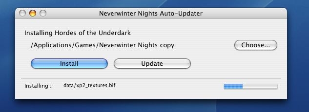 The NWN Auto-Updater program is designed to provide a simple user interface which enables users to automatically download and apply updates to the NWN Installations on their Mac. Additionally it will also update/install SoU and HotU from the Linux resources on the SoU and HotU CDs. Updated and compatible for 1.62 Base/SoU/HotU. This is a fix to .99 rc2 and rc3 problems with installing HotU on 1.62.