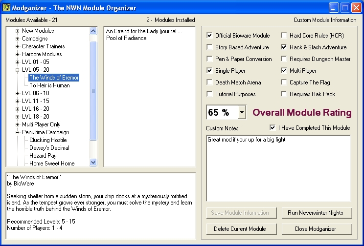 Modganizer is a Neverwinter Nights module organization tool. Create and maintain a library of player created modules where you can store additional information about each module. Please see the ReadMe.txt for the full Feature Set and System Requirements.