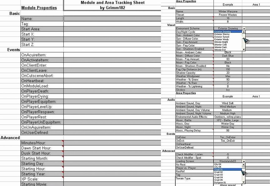 Module and Area Tracking Sheet by Grimm182 Short: Use this to list out lots of module and area information. (tilesets, loadscreens, music, scripts, etc.) Long: This spreadsheet may be of use for tracking lots of areas with the NWN Toolset. I use it so that I can see an overview of all my areas and make sure I didn�t miss anything or have different areas with the same �look�. There are 3 tabs: 1) Module � this has the same basic info as the Module Area from the edit dropdown in the toolset. 2) Area � this has the info from Area Properties and 3) Data � this contains the drop down list info so that you don�t have type in a whole bunch of info every time. Misc: The dropdown list includes menu options from Shadows & Hordes. I padded 20 extra cells in the data sheet so custom content could be added� Included is a pdf version of this for people who do not have excel�but there are better �paper� versions on the vault I believe.