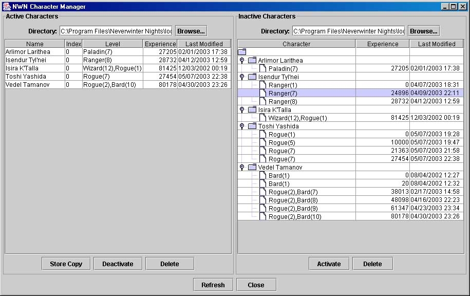 This is a utility to manage NWN characters. It allows you to save and manage versions of your characters at many different levels and to transfer these versions into and out of your NWN active character directory.