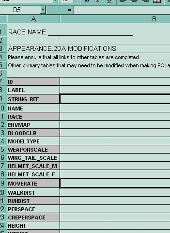 This is an excel spreadsheet designed to be printed as seperate pages. The idea being that it is fairly easy to lose track of the various creatures that you have added into the game using HAK Packs etc. With this Spreadsheet you can keep track of the changes you made to the various .2da files and refer back to them should you lose your data, or even want to create a similar critter. Copy the form and pass it on to anyone else who is trying to learn, so that they too can create custom creature content based on your originals. (Some basic guide markers are included but it is meant as a companion to the Custom Content Guide by Eligio Sacateca.