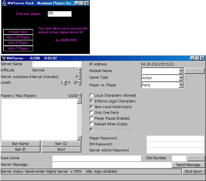 This program can be used to edit the max number of players allowed on a server. Works with version 1.59 of the game only (v.7054 server). Note: If anyone wants me to release a version of this program for an earlier server version, please let me know. In addition, if this program in any way angers Bioware, let me know and I will not distribute it.