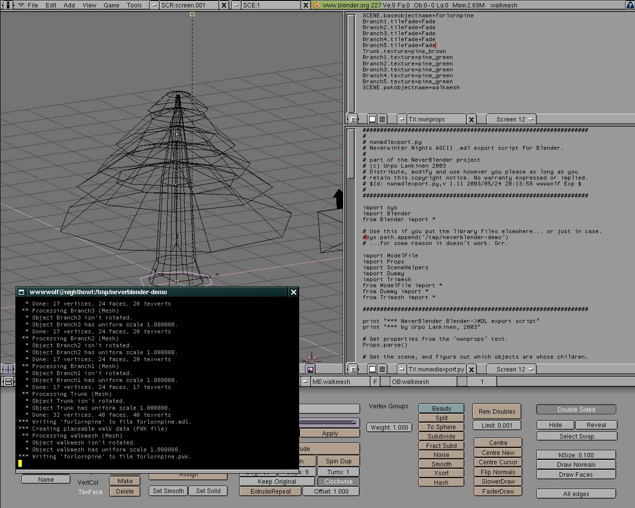Some scripts to make NWN and Blender (http://www.blender3d.com/) modelling app cooperate. The goal is to make a comprehensive MDL exporter and importer for Blender. At the moment, exporting already works for most parts and it can be used for *some* tasks. The scripts should work in any operating system Blender runs on (primarily coded in Windows, lightly tested in Linux). 2003-10-12: No new uploads - just changed the file URL to point to the new location due to site redesign. A side note: The thing is also now in the Blender Projects Page (http://projects.blender.org/projects/neverblender/), and you can get the prerelease code from CVS. Tons of cool stuff coming in the next release!!!