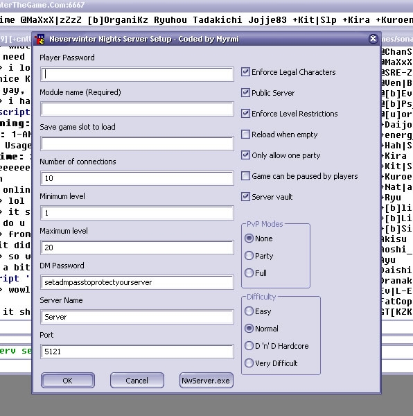 This utility lets you set up a Neverwinter Nights multiplayer Server from within mIRC. If you download it, read the readme within the zip file first for instructions on use and installation. Feel free to email me with comments and suggestions for future versions.