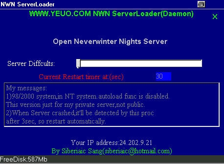 Now,07-18-2002 new version release,please re-download!!! Many feature added! ----------------------------- HOW TO & WHAT CAN IT DO FOR YOU? 1) nwn server auto change map at 60min after(it will not change by you,maybe next version) [maplist:Chapter1,1E,2,2E,3,4 these only] 2) It can support win2k/xp/98 but not support NT or others. 3) server crash guarding! when the server crashed.it will be restarted automatically! [Detecting in 5sec] Now you have the server with 24hours x 7 running keeper,you will not look up it forever;) Ok.have fun. |