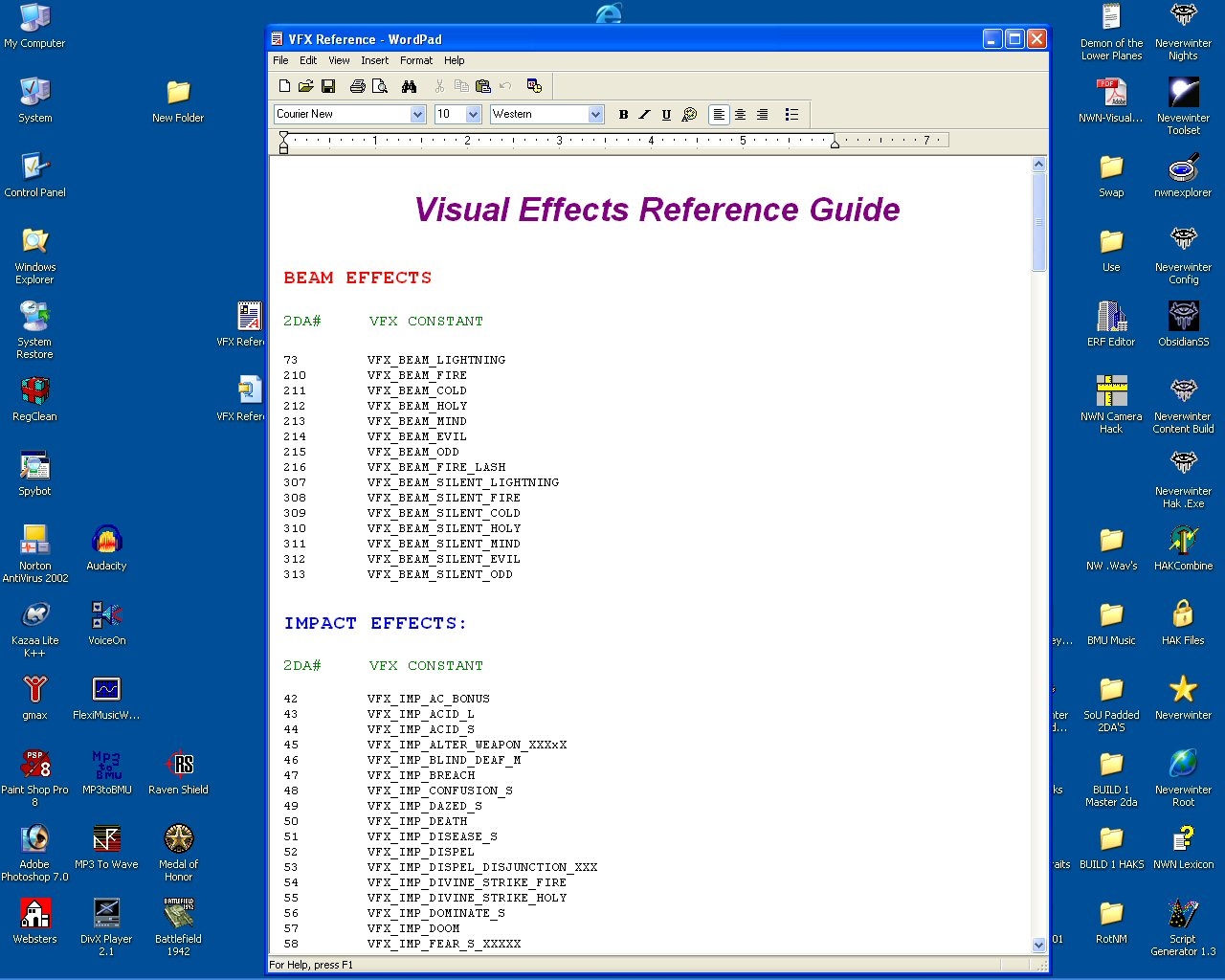 I created this VisualEffects 2da reference to make it easier to look up desired effects directly from the VisualEffects.2da. It is intended to be a quick source to aquire the desired .2da reference number for scripting purposes. I made this for my scripting needs. I know I will use it. If any of you peeps get any mileage out of it, then be my guest. :) Don't be fooled by the picture above. It only shows a small portion of the reference guide... all of the VFX's are arranged by VFX type and then put in numerical order according to the 2da refernce #.