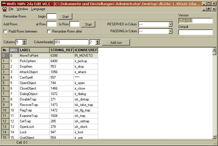 Small multilanguage 2da Edit for nwn, includes the files for translation. Avaible languagesfiles: German, English, Polish, Spain, French, Italian and Russian. Only the german and english files are ready to use the other files all in english. Features: renumber ids, insert rows, add rows, delete rows, patch 2da file and make new 2da files -- Kleiner Mehrsprachiger 2da Editor f�r NWN, inlusive der Sprachdateien. M�gliche Sprachen: Deutsch, Englisch, Franz�sisch, Spanisch, Italienisch, Polnisch und Russisch. Es sind nur die Sprachdateien f�r Deutsch und Englisch fertig. Die anderen enthalten nur Englische Eintragungen.
