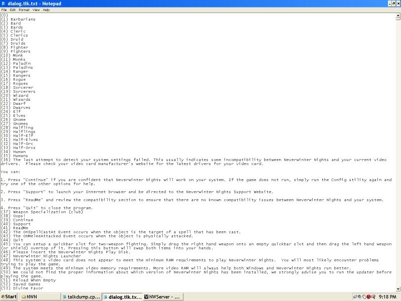 I was looking for a program that could dump dialog.tlk files to ascii so that I could do some easy lookups of StrRefs. I came across Revinor's old talkdump program in his ctools 0.4 package. Seems he stopped supporting it even though it did one thing that no other tlk editor I found could do: created plaintext of the tlk.