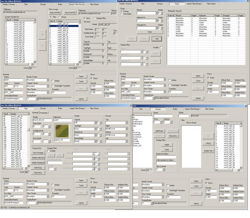 Set file Editor is for editing Tileset file(!).Can filter display to easy find tile,group or rules. Easy import Tile and full group from another Set file with automatic copy of MDL,WOK,TGA,DDS. Missing file checker, textures checker/viewer/renamer. ITP palette file generator. New in Beta 0.85 - Options are now saved in registry. - Confirmation message appear when you try to import existing tile or group. - You can sort list by clicking on column (useful to get an organized group list). - Minimize button added.