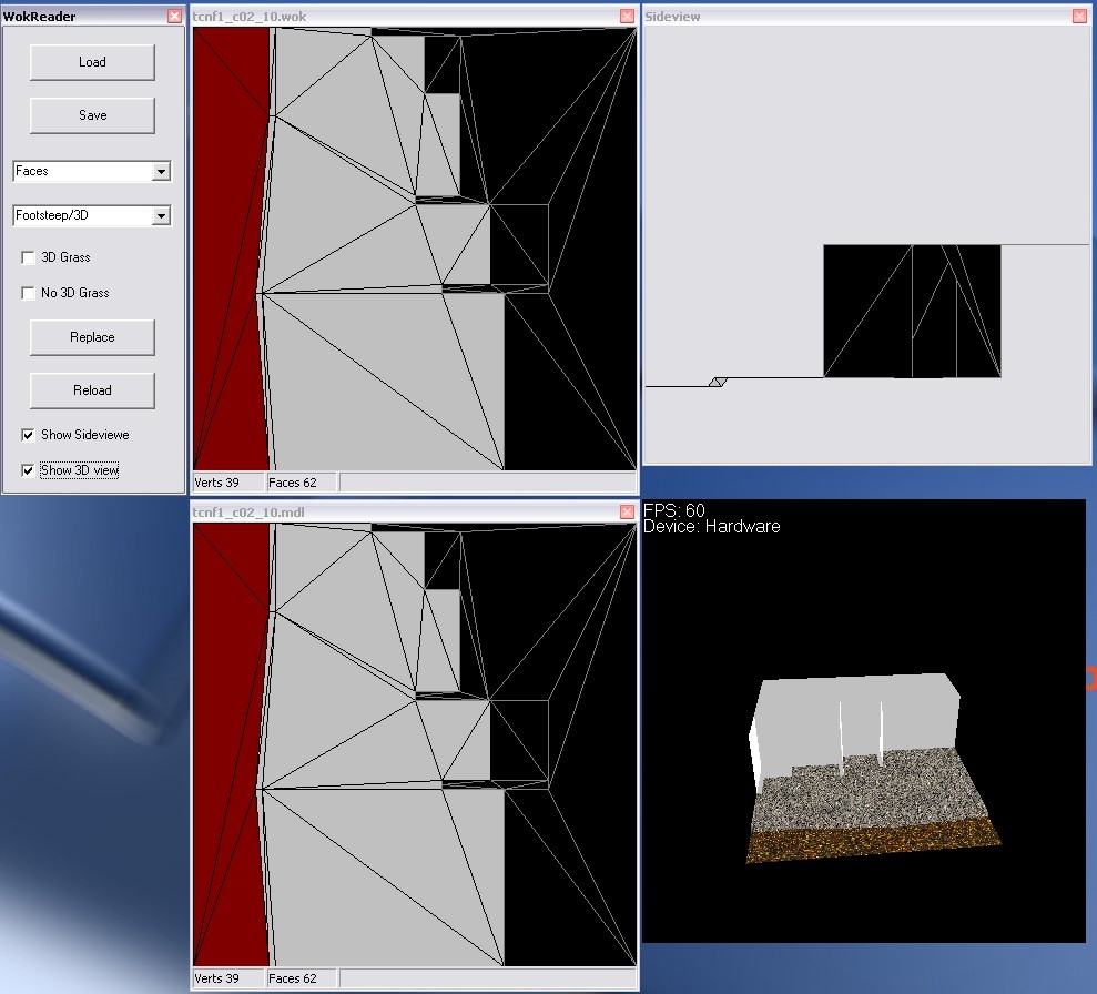 This little tool can open Tileset walkmesh (.wok) and Placeable walkmesh (.pwk) and edit the footstep sound and 3D effects. Let me know if I should work some more with it, to enable changing of the Points of the faces or something else. Version 7 this one works again but it is not posible to add, remove or change points (verts), it is only posible to change 3D anim. (in mdl file) and sounds (in wok file). I have added a 3D view of the walkmesh model and a 2D side view. Im stil working on the add, remove and change thing... but it will take some time.. Updaded to suport snow, sand is the same as dirt... Updaded to suport mouse drag.. the grafic is blinking.. Updated to loade model into 3D window.. Fixed bug in Replace function....