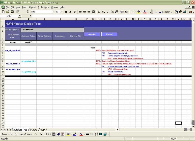 This Excel utility was designed to aid Neverwinter Nights builders during the process of creating NPC conversations. Specifically to allow a convenient way to view and maintain all of the dialogs in a module outside of the toolset.