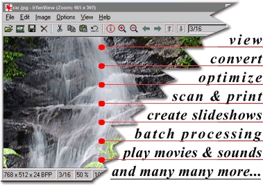 IrfanView is a fast and simple image viewer and editor that supports all major graphic formats, including BMP, DIB, JPEG, GIF, animated GIF, PNG, PCX, multipage TIFF, and TGA. In addition, it features drag-and-drop support, directory viewing, TWAIN support, slide shows, batch conversion, and modifications, such as color depth, crop, blur, and sharpen.